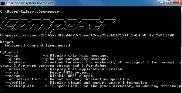 - Setelah terinstall, coba cek dengan menggunakan perintah composer di Command Prompt