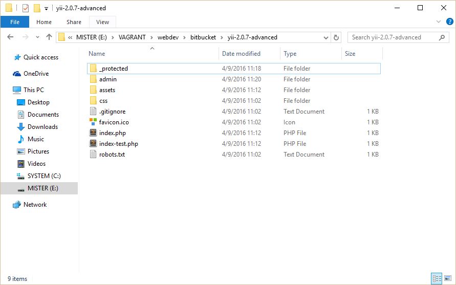- Pindahkan semua direktori dan file Yii 2.0 Advanced kedalam folder _protected yang telah dibuat.